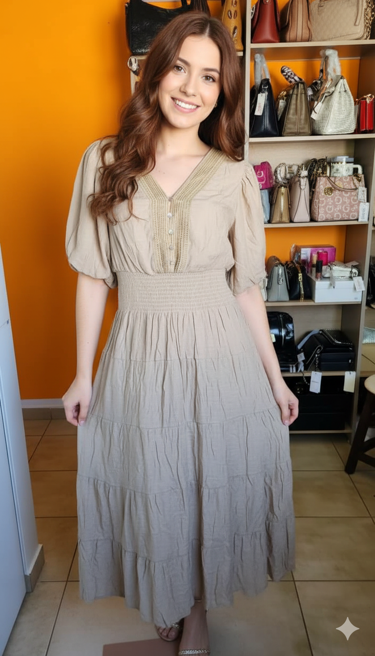 Este es un vestido de estilo bohemio y romántico, en un tono tierra o beige oliva suave, ideal para looks relajados y naturales.