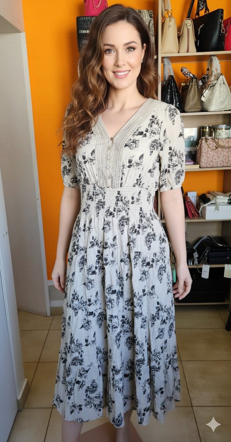 Este es un vestido largo de estilo boho romántico, en tono beige claro con estampado floral en negro, ideal para un look femenino, natural y elegante a la vez.