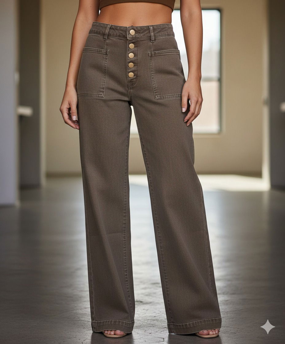Es un pantalón de tiro alto en color marrón claro o beige tostado, confeccionado en una tela tipo denim o bengalina rígida, con un acabado ligeramente desgastado que le da un efecto vintage.